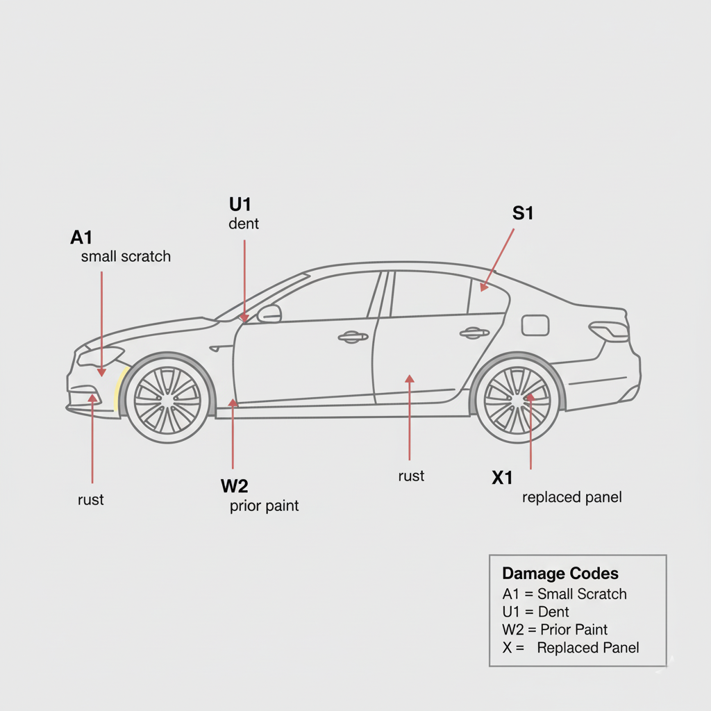 At the bottom of many sheets sits a tiny car diagram dotted with letters and numbers. It’s not a formality; it’s a repair estimate on a page. Learn these codes and you’ll negotiate like a pro: